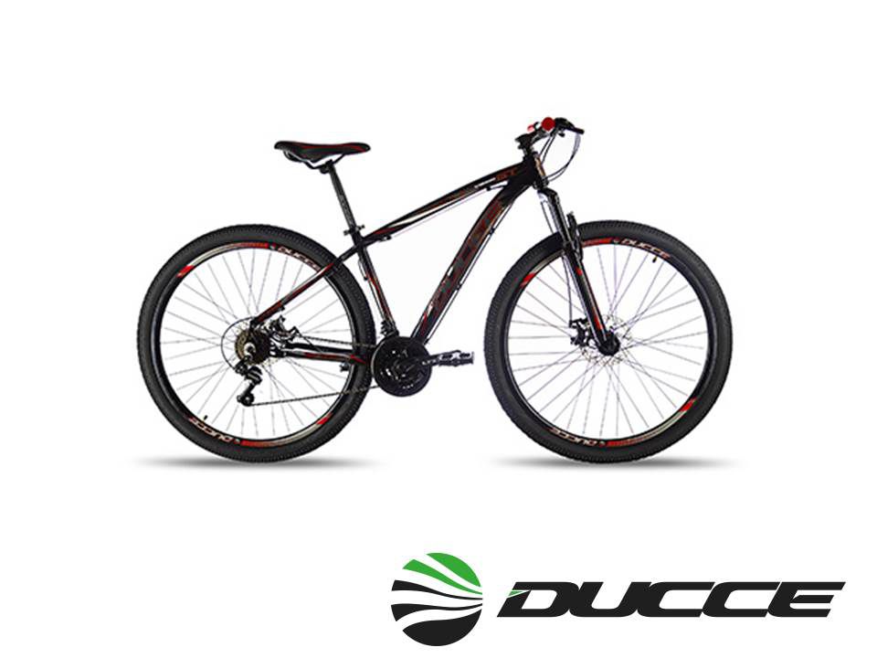 Bike com câmbios Shimano de 21 velocidades, freio a disco de 160mm, quadro de alumínio, suspenção de aço Ducce e roda livre 14×28 dentes. A Ducce X1 Suportar até 90kg tranquilamente.